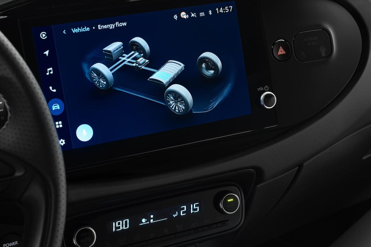La batterie de 0,8 kWh de cette motorisation hybride ne trouvait toutefois pas facilement sa place à l'avant, Toyota a donc décidé de la monter à l'arrière. Cela n'a toutefois aucune incidence sur le volume du coffre, car le bloc-batterie a été habilement dissimulé sous la banquette arrière. Vous pouvez donc toujours compter sur un coffre de 231 litres, ce qui n'est certes pas énorme, mais tout à fait acceptable pour une citadine... Et en parlant d'habitabilité : Toyota a doté le tableau de bord de boutons supplémentaires, d'un instrumentation numérique de 7 pouces et d'un nouveau système d'infodivertissement avec mises à jour over-the-air.